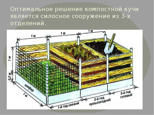 Наиболее эффективно процесс перегнивания органики происходит в компостном ящике и компостной яме, поскольку влажность и температура в них практически постоянные. Чем больше и полнее яма (компостер), тем быстрее «созревает» компост. Оптимальные габариты ямы – 1,5×2 м, глубина – около 1 м. Можно сделать яму длиннее и разделить ее пополам перегородкой, за которой будет удобно складировать готовый компост.